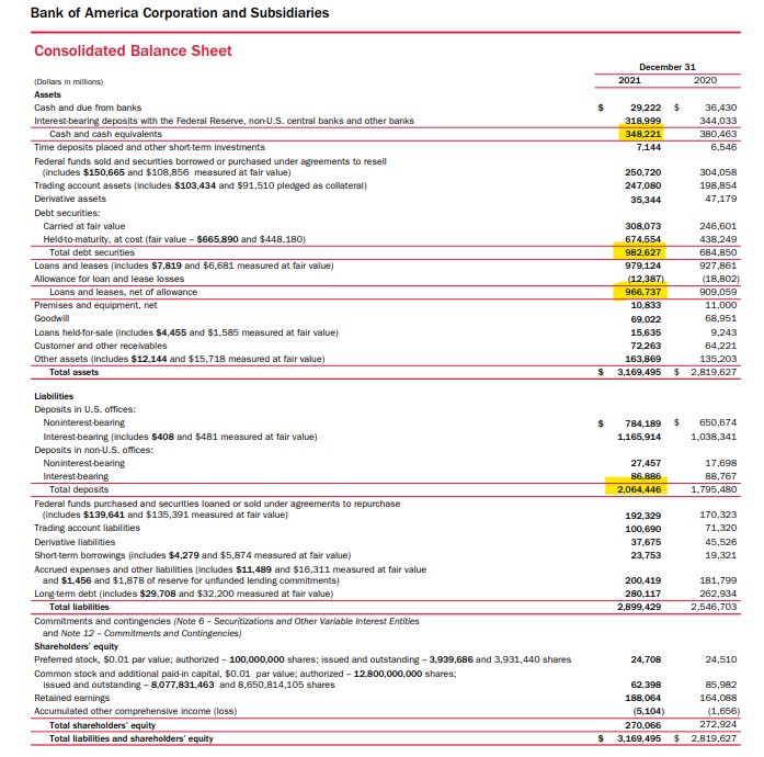 There is another aspect of the presentation format that is important for value investors to understand and appreciate. Large companies, those in the top 2,000 in the United States, tend to report the most important assets first, along with their prioritized liabilities. Look at the REIT’s presentation above. Almost all REITs present in a similar format; they list their net real estate book value (cost basis less depreciation taken to date) as the first asset on the books. Whereas banks list their cash available, then their portfolio of securities they own, and loans they’ve made. Look at Bank of America’s format: