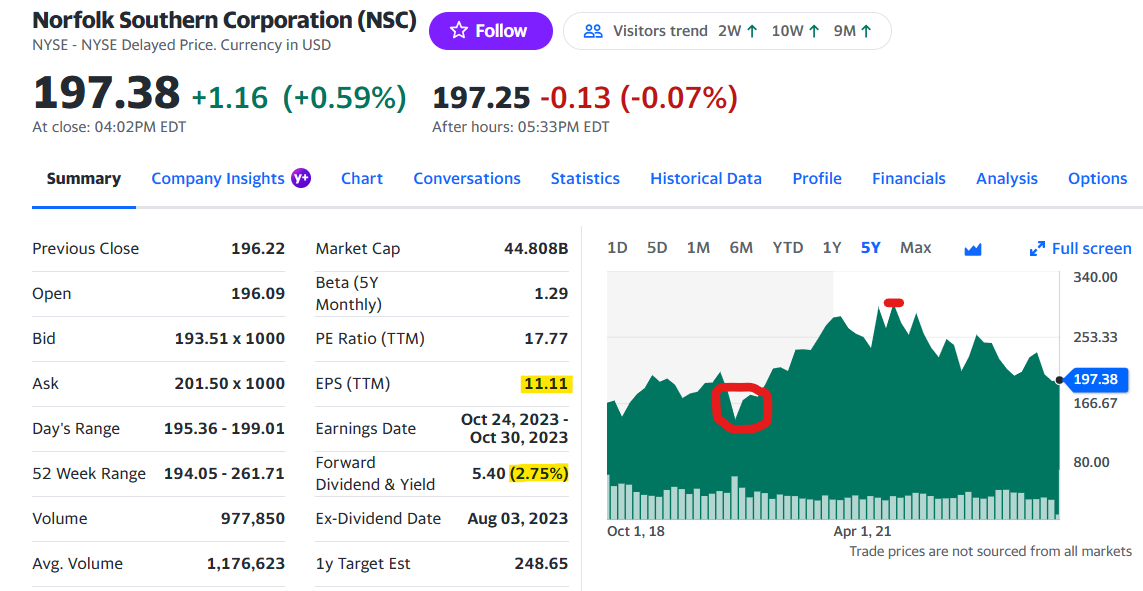 The historical market price for Norfolk Southern Corporation has only dipped below $170.00 per share once in the last three and three-quarters years. This occurred during the pandemic market chaos in March of 2020 (as indicated by the red circled zone). The share price peaked at $271 as marked by the red line. Look at this basic presentation chart: